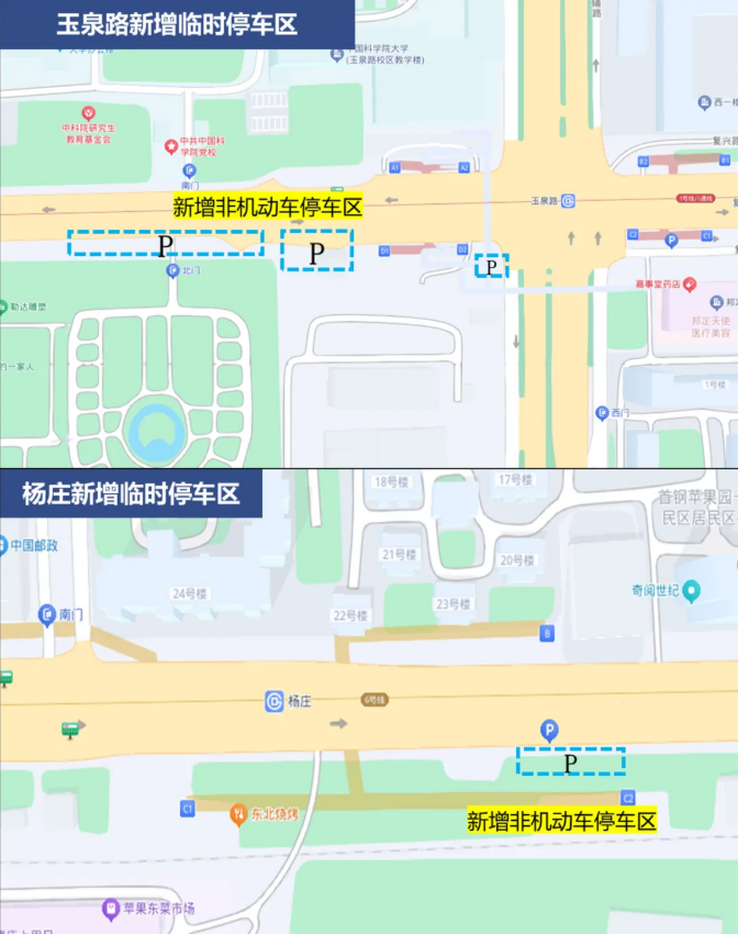 石景山区通过对轨道站点周边绿地边缘、桥下空间、公共广场等区域进行优化设计,在地铁1号线玉泉路站、地铁6号线杨庄站周边挖潜新增4处非机动车集中停放区域,累计拓展面积约4000平方米,新增非机动车停车位约3000个。请市民将非机动车有序停放在轨道站点周边指定区域,共同营造良好停放秩序。