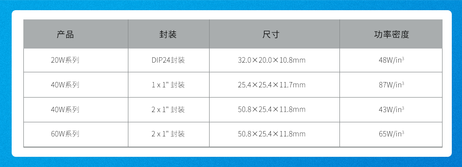 全系列产品功率密度高,体积小,可有效减小占板面积,提高客户系统空间利用率。