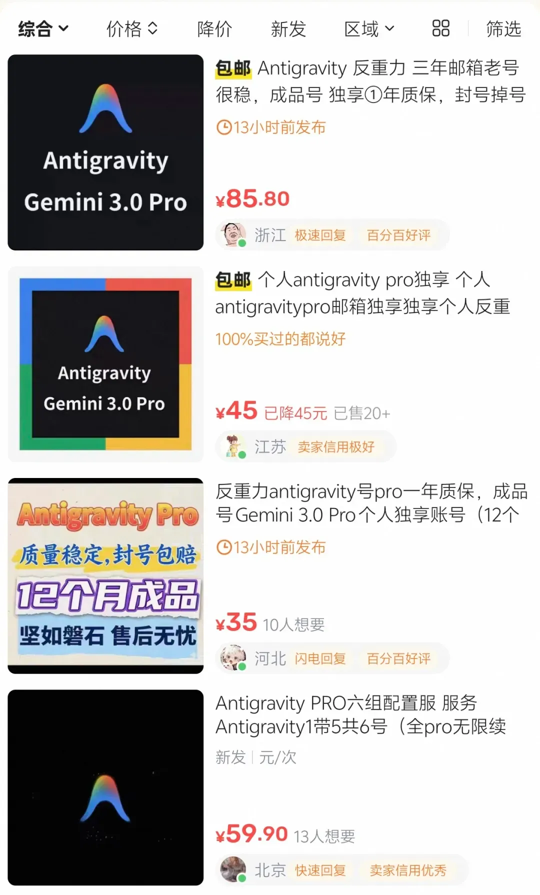 闲鱼上售卖的Antigravity共享账号