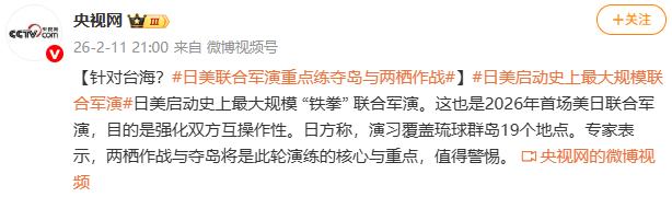据央视网微博消息,日美启动史上最大规模“铁拳”联合军演。这也是2026年首场美日联合军演,目的是强化双方互操作性。日方称,演习覆盖琉球群岛19个地点。专家表示,两栖作战与夺岛将是此轮演练的核心与重点,值得警惕。