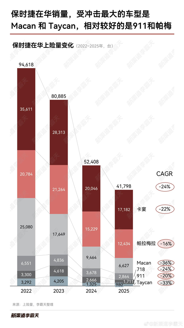 曾在保时捷任职的姜客跟我们说,其实买跑车的圈子很小,来来回回就是那么一些人,保时捷这两年销量确实掉得挺厉害,但是 718 和 911 销量变化不算特别大。