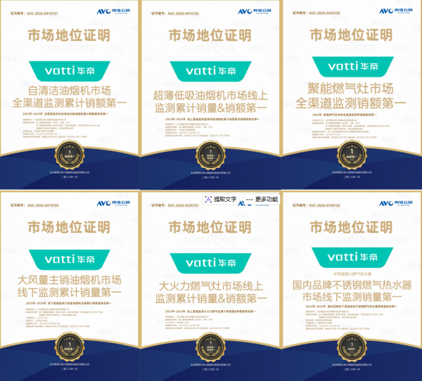 过去一年里,“厨电三杰”之一的华帝在创新引领上表现尤为突出。近期奥维云网(AVC)公布了2025年厨电市场的监测结果,数据显示,华帝在多个细分赛道上摘得魁首:超薄低吸款式油烟机线上渠道累计销量第一,销售额第一;含蒸汽清洗和高温溶解功能的自清洁油烟机,全渠道累计销售额排名第一;风量≥30m³/min+的大风量油烟机线下渠道累计销售量第一;聚能燃气灶全渠道零售额第一;不锈钢燃气热水器零售量第一......