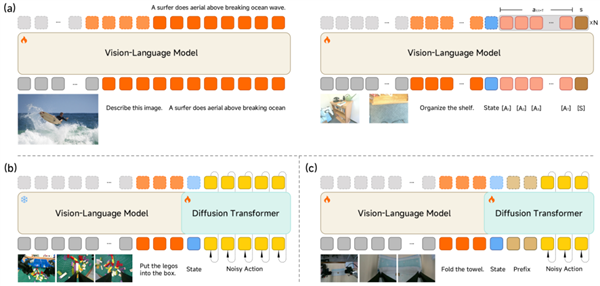 动作执行小脑(Action Expert):嵌入多层Diffusion Transformer(DiT),不直接输出单一动作,而是生成高频、平滑的“动作块”,并通过流匹配技术保障动作精准度,让机器人动作更具物理灵活性。