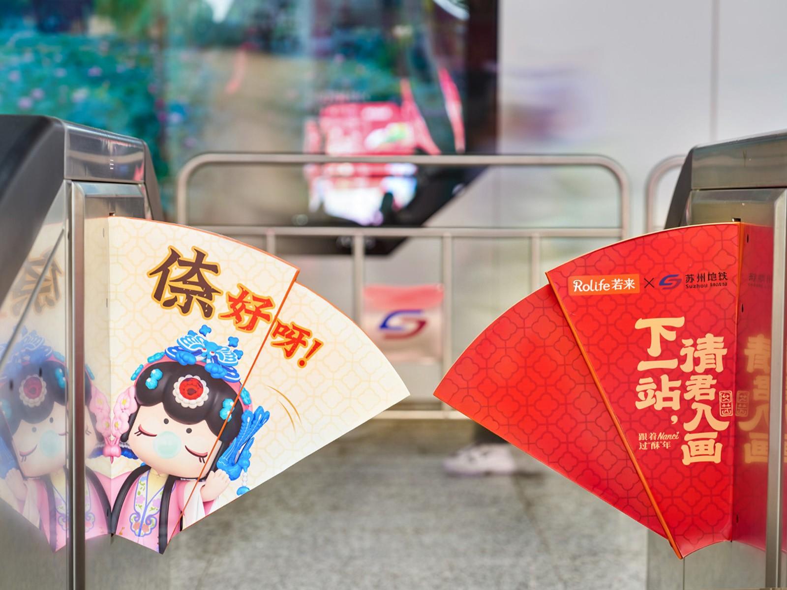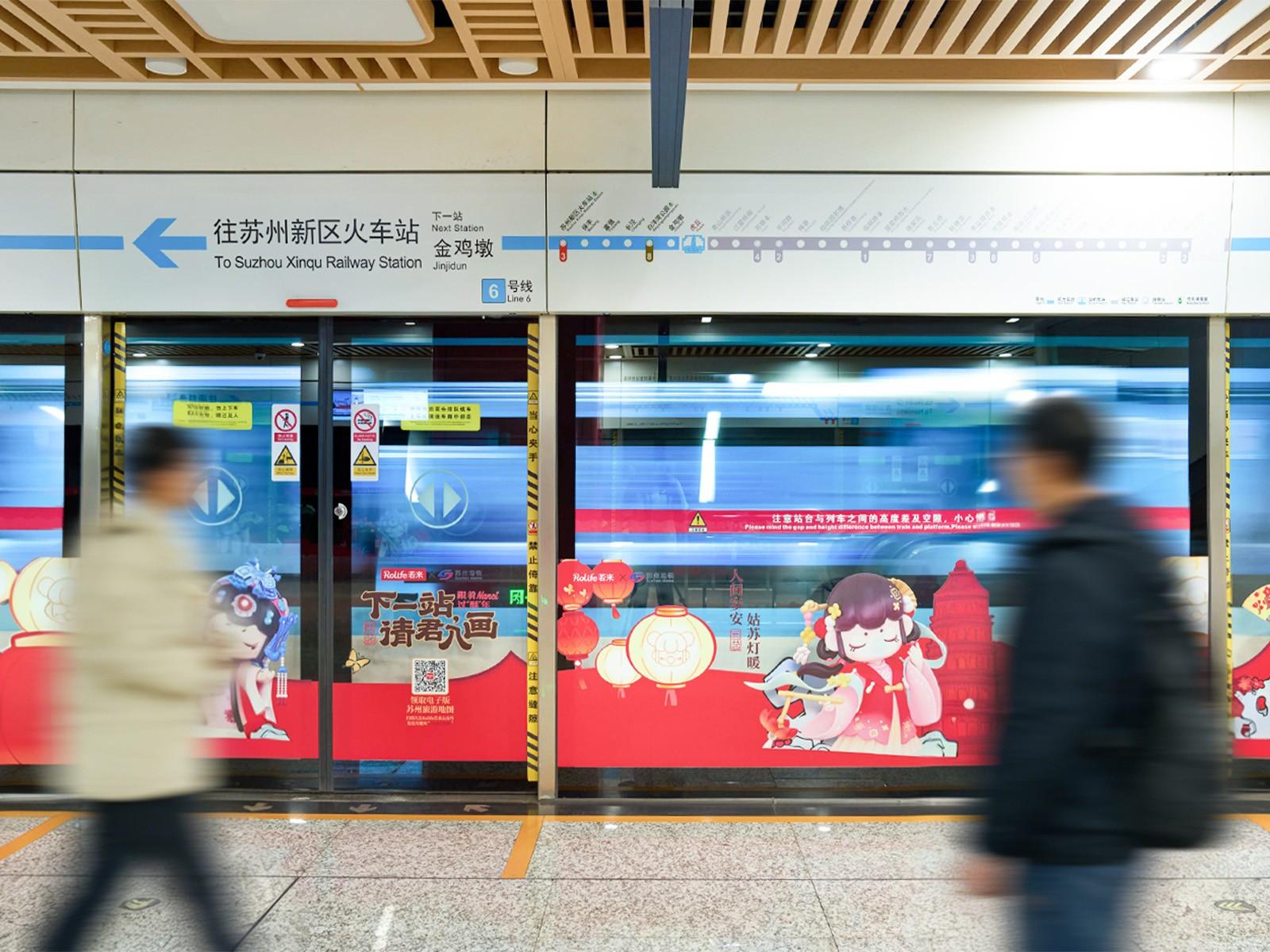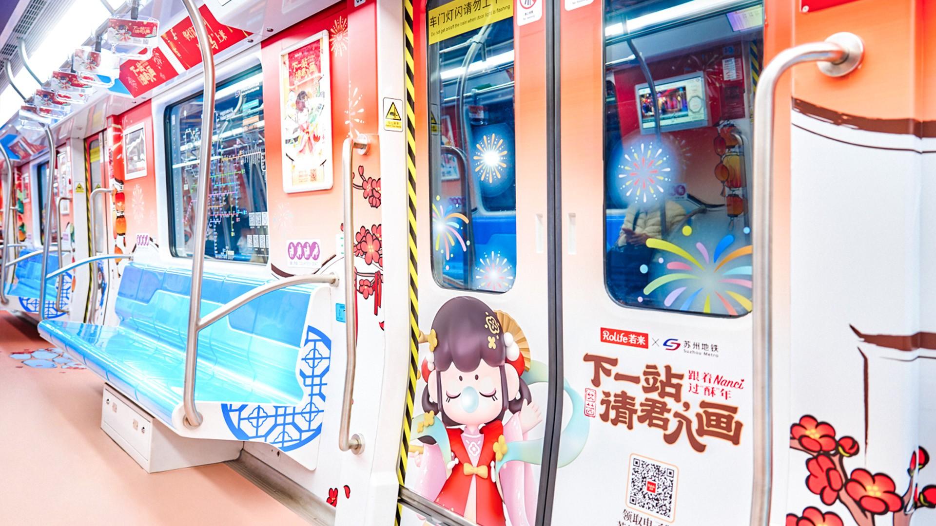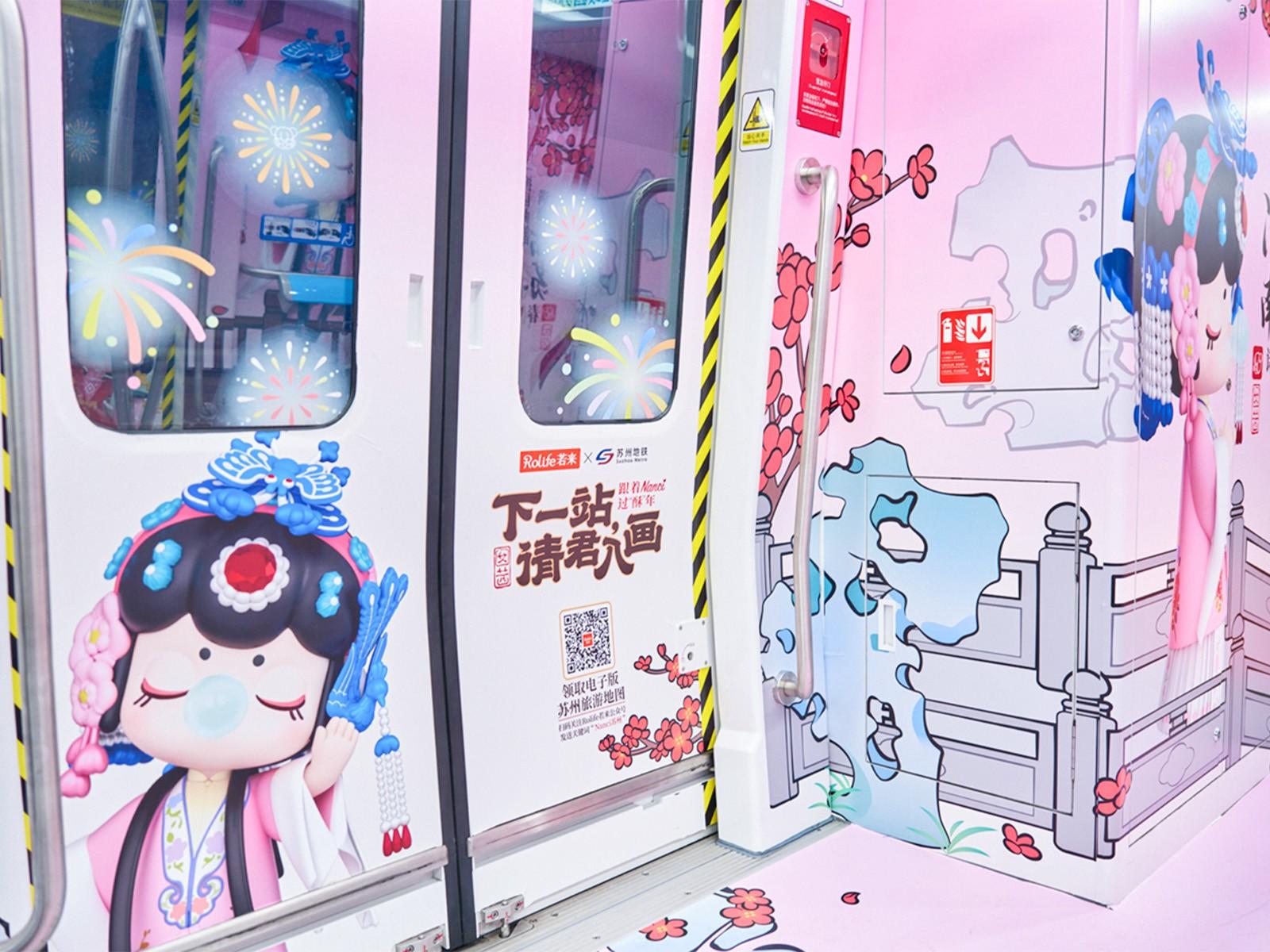 近日,Rolife若来携旗下原创IP形象——苏州囡囡 Nanci,与苏州地铁共同打造新春主题活动“下一站,请君入画”,相关主题内容已在地铁空间陆续呈现。通过主题车厢与特色站点的布置,苏州园林意象与传统年俗元素被引入城市通勤场景,在日常出行空间中勾勒出具有苏式韵味的新春画面。
