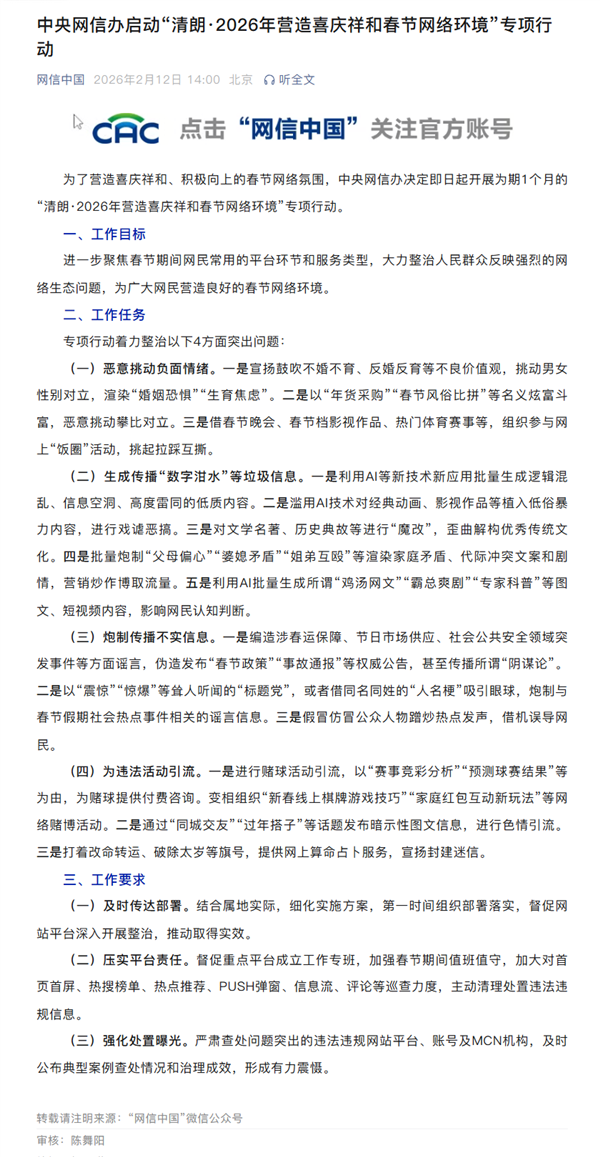 快科技2月12日消息,网信中国公众号今天发文宣布,为了营造喜庆祥和、积极向上的春节网络氛围,中央网信办决定即日起开展为期1个月的“清朗·2026年营造喜庆祥和春节网络环境”专项行动。