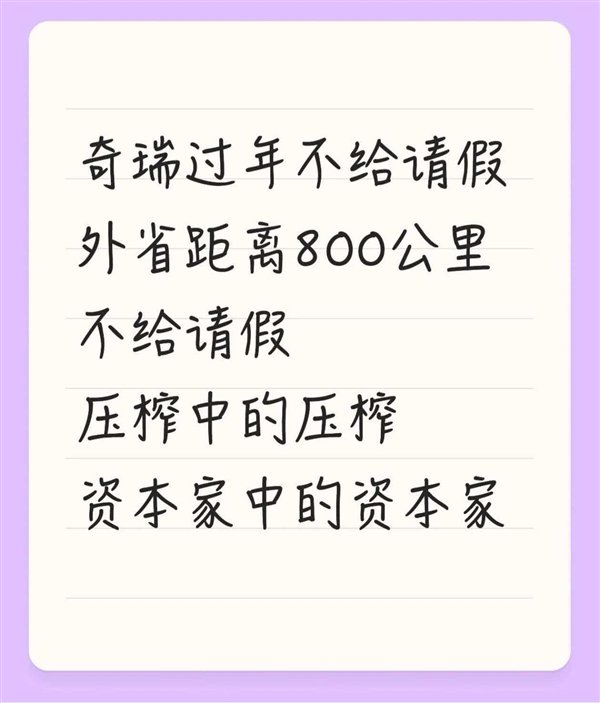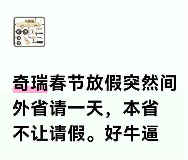 快科技2月12日消息,近期,有多位奇瑞汽车的员工在社交平台发声,对公司春节前后实施的请假管控政策表达不满。