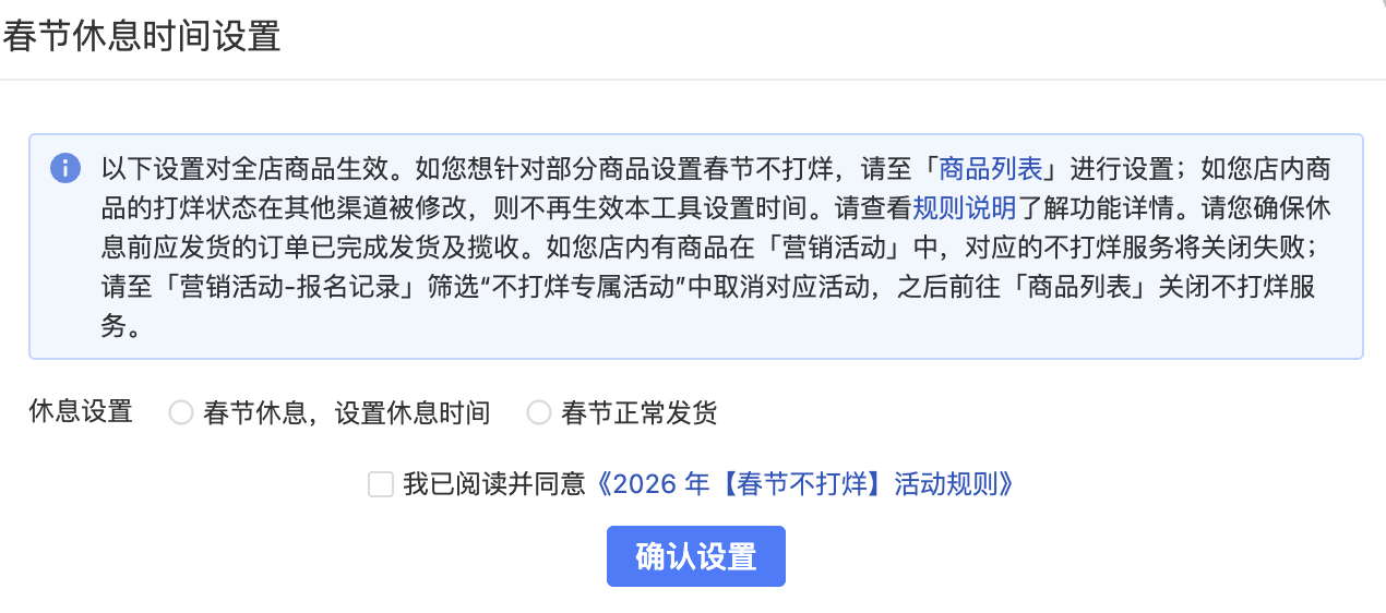 比如,在功能设计上,商家可提前设置具体休息时间段。系统会根据不同时间段,自动展示对应的发货要求:在非休息时间,平台将结合“春节不打烊”活动及商家设置情况,为商品自动开启“不打烊”标签,获得相应流量倾斜;在休息时间内,商家无需下架商品。