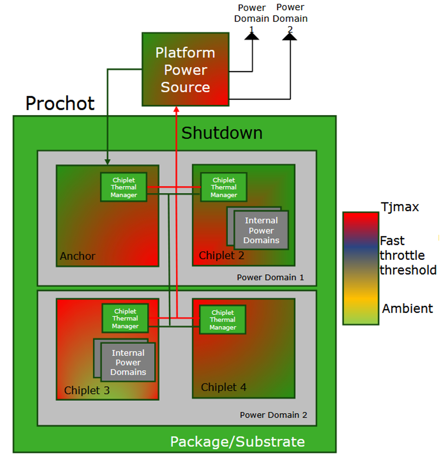此外,3.0 版本新增了两个开漏引脚,实现快速节流和紧急关断功能:当任意芯粒检测到温度过高时,一级阈值触发降频运行,更高阈值则触发所有芯粒同步关断,避免过热损坏。