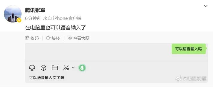 2月13日,腾讯公司公关总监张军发文称,“在电脑里也可以语音输入了。”配图是电脑微信界面。