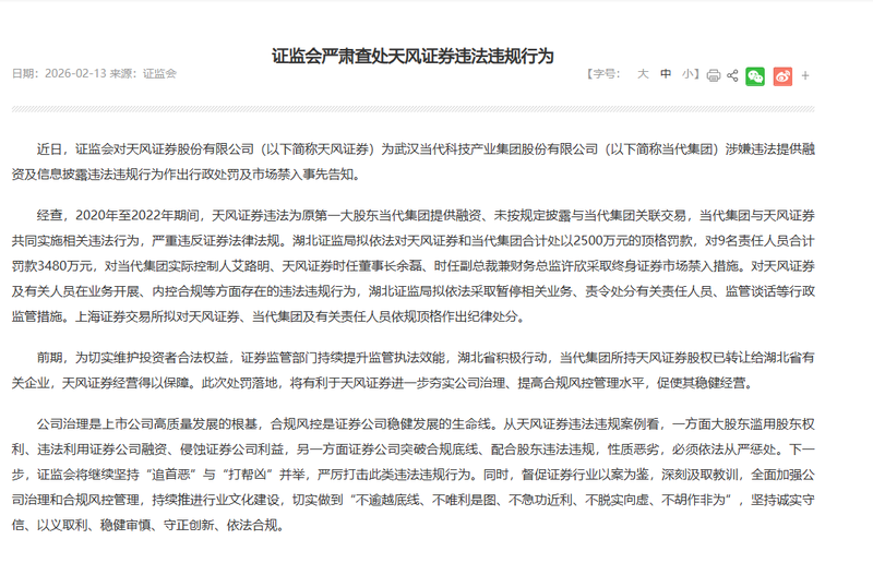 新京报讯 据证监会网站消息,近日,证监会对天风证券股份有限公司(以下简称天风证券)为武汉当代科技产业集团股份有限公司(以下简称当代集团)涉嫌违法提供融资及信息披露违法违规行为作出行政处罚及市场禁入事先告知。