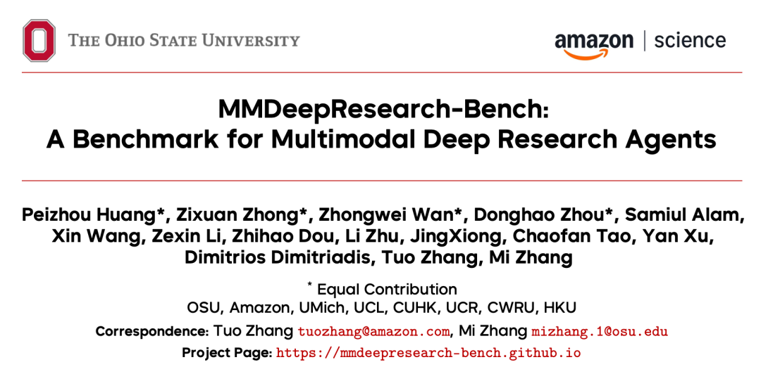 俄亥俄州立大学与 Amazon Science 联合牵头,联合多家高校与机构研究者发布 MMDeepResearch-Bench(MMDR-Bench),试图把多模态 Deep Research 的评估从「读起来不错」,拉回到一个更硬的标准:过程可核验、证据可追溯、断言可对齐。