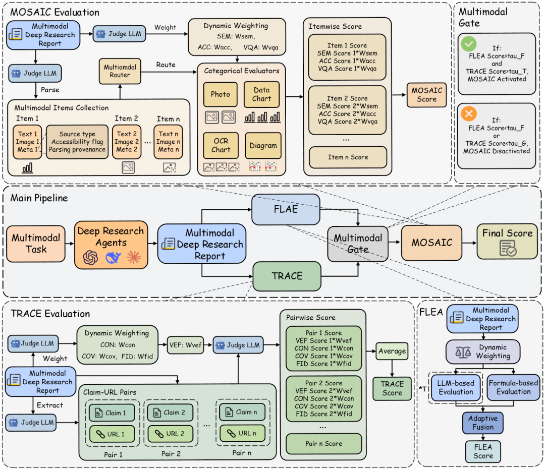现有评测往往缺一块关键拼图:要么偏短问答(图表问答、文档问答),要么偏纯文本深研(长文 + 网页引用),很难覆盖端到端的「多模态深度研究」链路:既要写研究式长报告,又要把图像证据与文本断言逐句对齐,并且能审计、能追责。