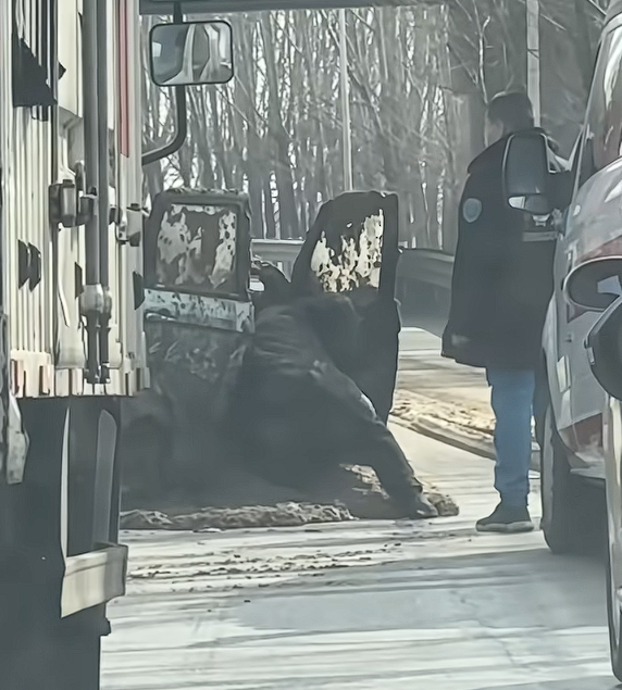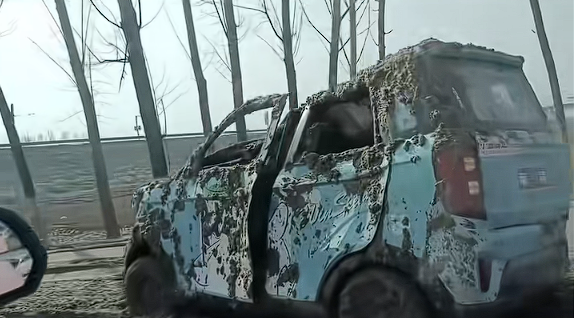 从现场拍摄的视频可以看到,这辆老头乐惨烈非常,车身弯曲,玻璃碎裂,外表被粪水完全糊满,有疑似驾驶员正从车门处从里往外拿东西。