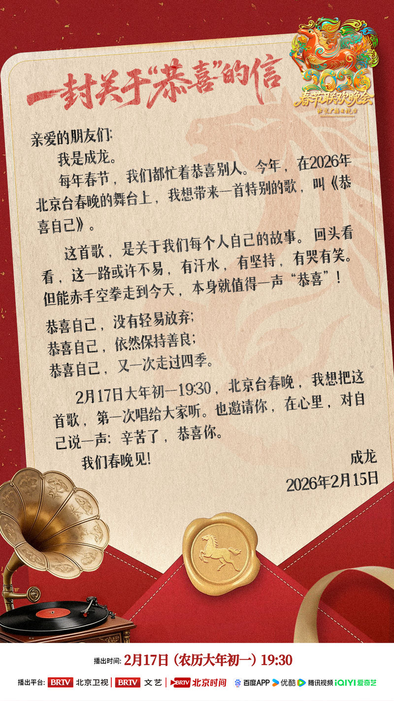 2026年北京广播电视台春节联欢晚会将于 2月17日(农历大年初一)19:30,在北京卫视、北京文艺频道、北京时间客户端等平台同步播出,一同锁定这支诚意满满的贺岁短片,在成龙与群星的歌声里,给自己一个拥抱,道一声“恭喜自己”。愿我们都能带着这份肯定,奔赴“春风得意马蹄吉”的马年新春,爱你老己,继续前行。