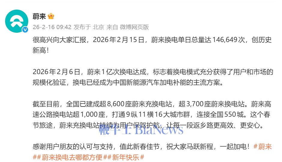 2月16日,蔚来今日发文汇报,2026年2月15日,蔚来换电单日总量达146,649次,创历史新高。