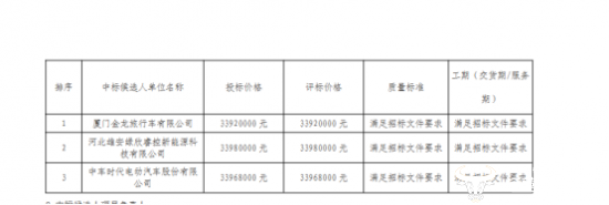 经过一系列严格评审,最终排在第一名的中标候选人是厦门金龙旅行车有限公司,投标报价3392万元;