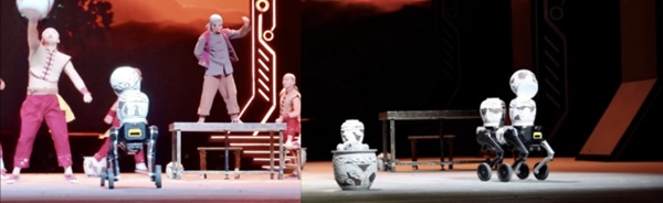 在《坛三彩》的舞台上,本末科技D1机器人如同被注入了“瓷韵灵魂”,成为演员们最默契的舞台搭档。它承载三个坛具,在四轮足与双轮足形态间无缝切换,自主完成拆分与拼接,既精准承接了杂技表演的协作需求,又避免了对演员动作的干扰;当演员俯身抬手,做出指引的姿态时,D1即刻响应,灵活穿梭于演员之间,进退有度,完美配合演员节奏。