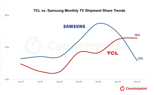快科技2月20日消息,调研机构Counterpoint Research给出的最新报告显示,TCL超越三星,登顶2025年12月全球电视出货量榜首。
