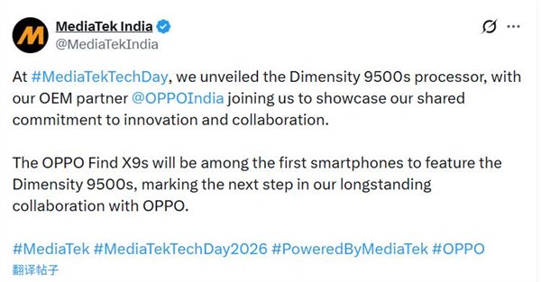 快科技2月23日消息,联发科在社交平台上正式宣布,OPPO将成为首批搭载天玑9500s旗舰平台的手机品牌。