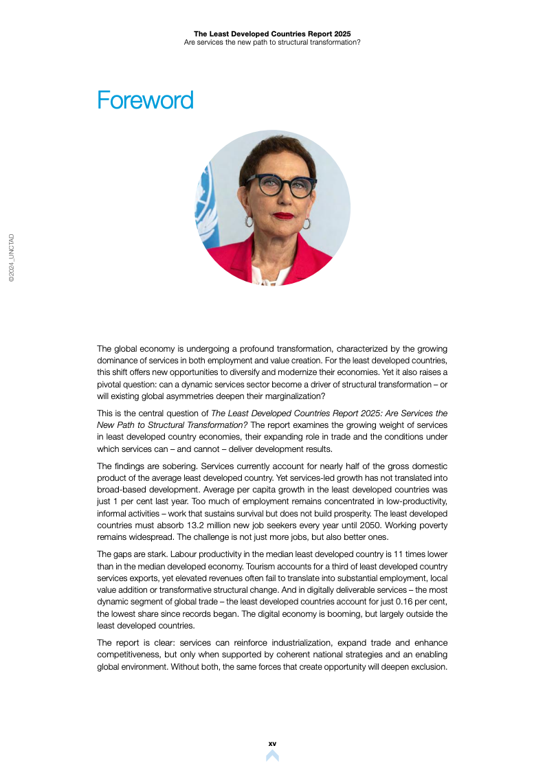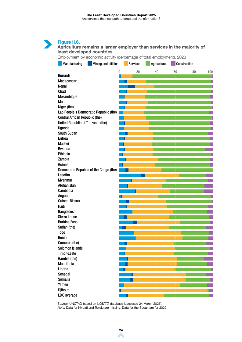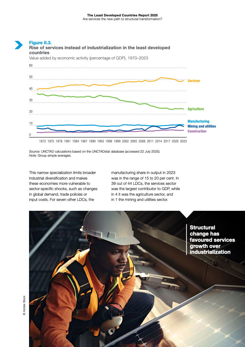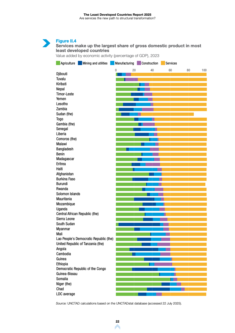 根据《2025年最不发达国家报告》,全球最不发达国家(LDCs)正经历显著的经济结构变迁。服务业已成为这些经济体增长与就业的核心支柱,但在生产率转化方面仍面临严峻挑战。