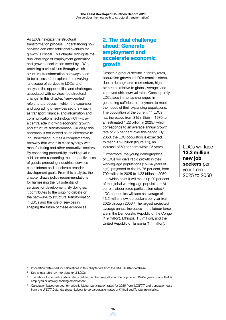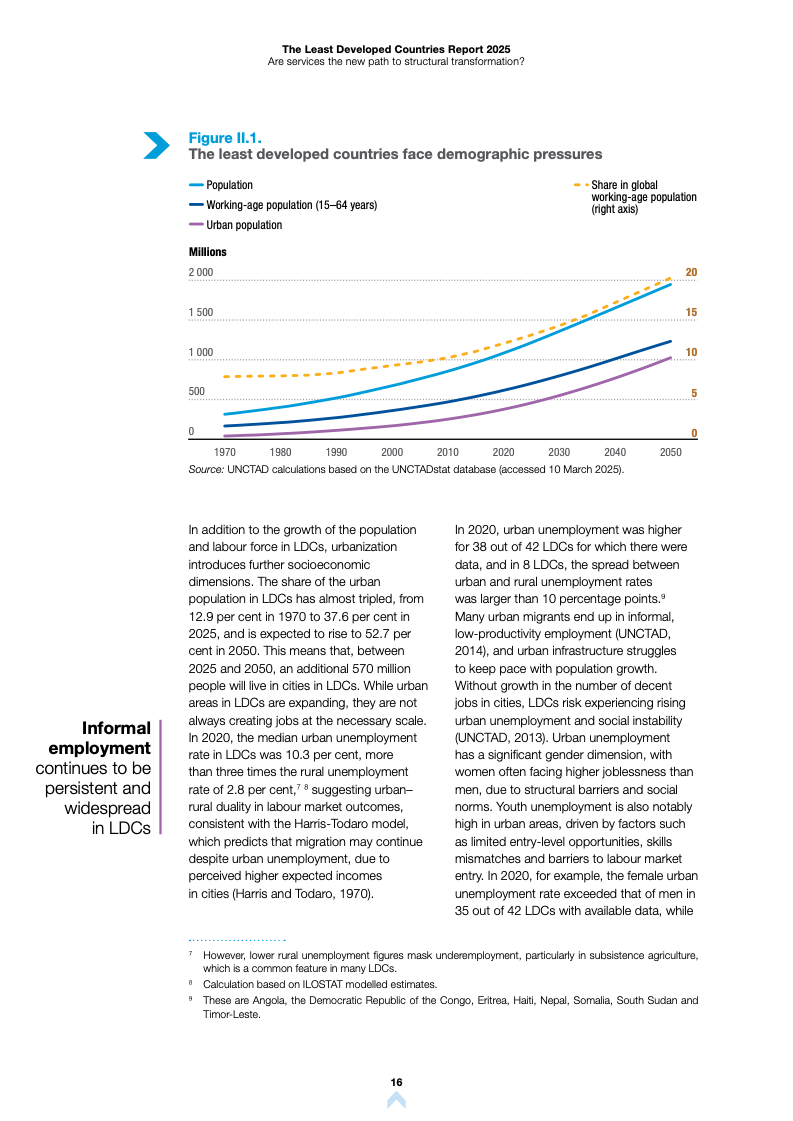 在就业层面,服务业吸纳了大量新增劳动力,但多数岗位集中在非正规零售及生计型服务等低效率领域。数据显示,从当前至2050年,LDCs每年需创造约1320万个就业岗位以应对人口压力。尽管服务业规模扩张,但由于缺乏优质岗位,就业增长与收入提升之间存在明显脱钩,工作贫困现象依然普遍。