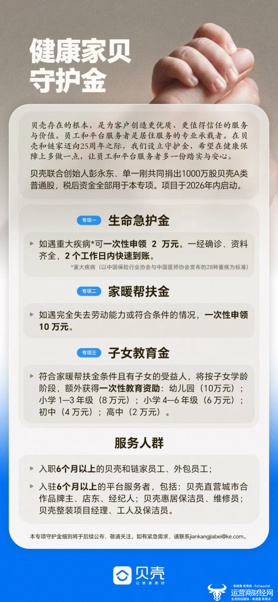 2月24日,贝壳联合创始人、董事长兼首席执行官彭永东和联合创始人单一刚在内部全员信中透露,在贝壳和链家迈向 25周年之际,将共同捐赠1000万股A类贝壳普通股,税后资金将用于设立“健康家贝守护金”,作为贝壳和链家员工以及行业服务者约50万人的保障金。按2月23日收盘价,该笔捐赠价值约4亿元,项目将于年内启动。