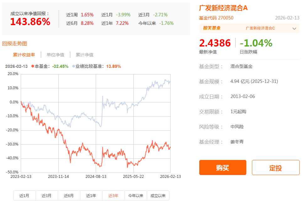 Wind数据显示,截至2026年2月13日(下同),广发新经济混合A年内净值下跌1.76%,同类排名4935/5095;过去1年净值上涨7.22%,跑输业绩基准超过8个百分点;过去3年净值下跌32.45%,跑输业绩基准超过40个百分点。