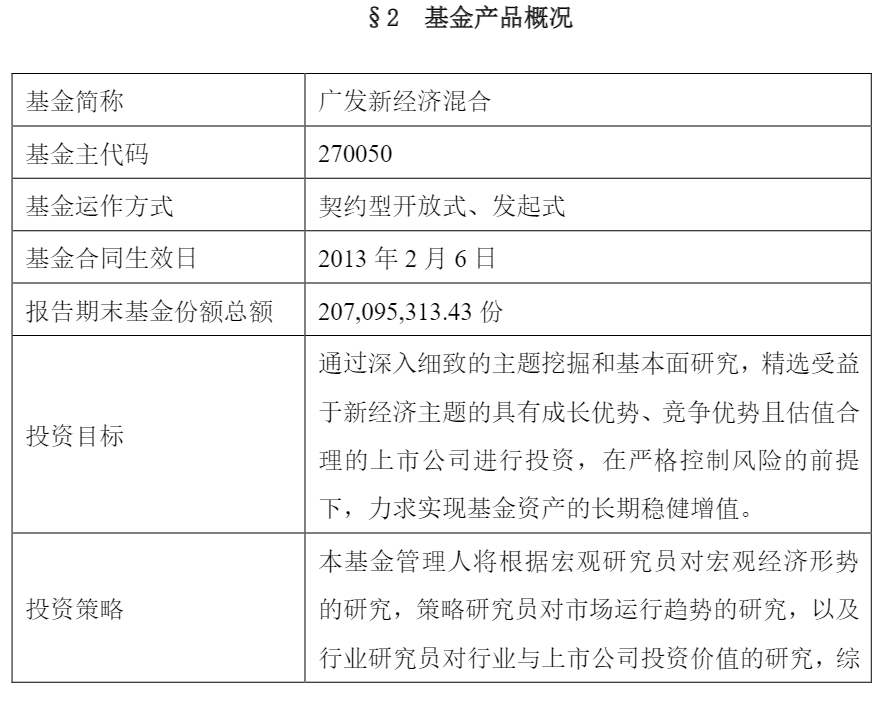 广发新经济混合的基金合同生效日为2013年2月。基金的基金投资目标为:通过深入细致的主题挖掘和基本面研究,精选受益于新经济主题的具有成长优势、竞争优势且估值合理的上市公司进行投资,在严格控制风险的前提下,力求实现基金资产的长期稳健增值。