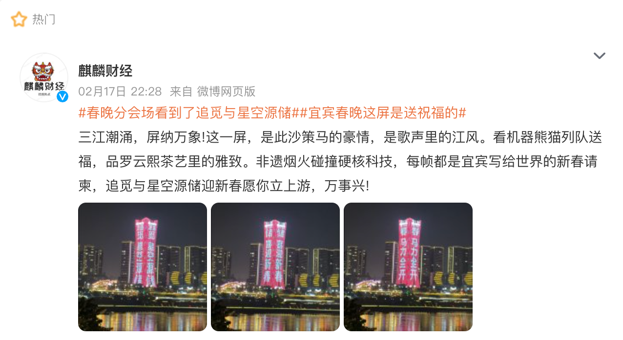 2026年央视春晚四川宜宾分会场精彩亮相之际,一处出现在三江口核心地标的大屏画面,意外吸引了不少观众的目光。在一众节庆元素与城市景观之间,储能科技品牌“星空源储”的画面频频出现,被不少网友称为今年春晚宜宾分会场的“隐藏彩蛋”。
