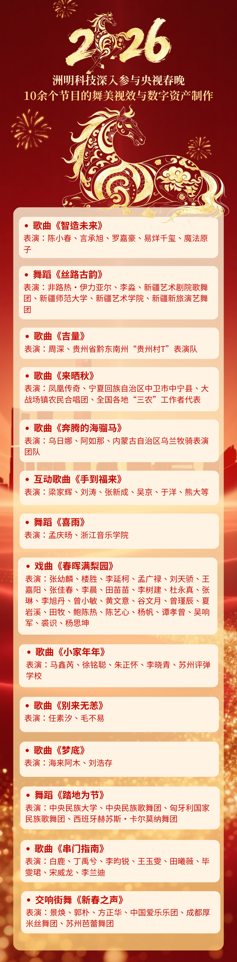 作为总台春晚的“老朋友”,洲明科技已连续五年深度参与这一国家级文化盛事。今年,在总台技术局与春晚导演组的统筹指导下,洲明不仅为北京主会场提供了顶尖的XR屏幕硬件支撑,同时深入参与了10余个节目的舞美视效与数字资产制作。从“物理视界”到“数字内容”,洲明以全方位的深度参与,为全球华人奉上一场科技与艺术高度契合的感官盛宴。