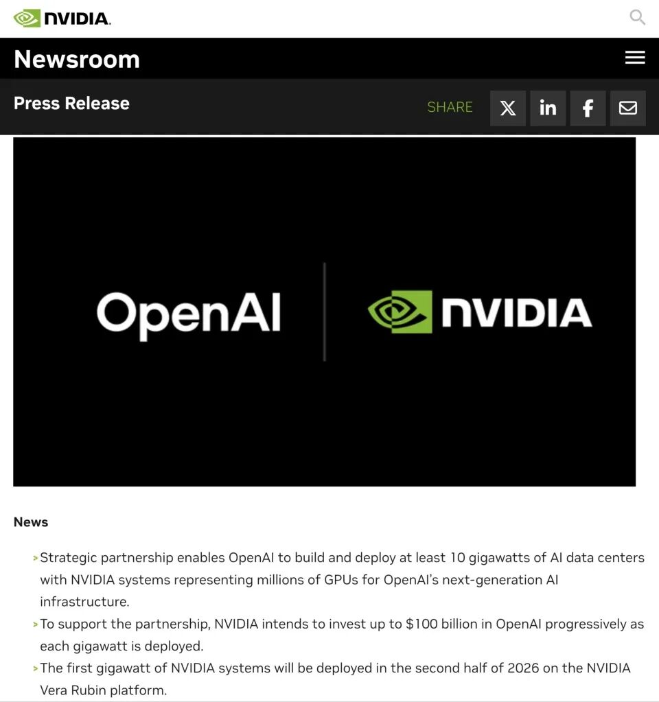 2025年9月22日,英伟达与OpenAI宣布,为支持数据中心和电力容量部署,英伟达计划随着新系统的部署,逐步向OpenAI投资高达1000亿美元。双方将建立战略合作伙伴关系,签订了一份具有里程碑意义的战略合作意向书:计划为OpenAI的下一代AI基础设施部署至少10吉瓦的英伟达系统,用于训练和运行其下一代模型,从而部署超级智能。第一阶段部署预计将于2026年下半年在英伟达Vera Rubin平台上线。