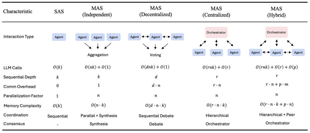 本研究评估了五种典型的智能体架构,并总结了它们的计算复杂度、通信开销和协调机制。k = 每个智能体的最大迭代次数, n = 智能体数量, r = 协调器轮数, d = 辩论轮数, p = 对等通信轮数, m = 每轮平均对等请求数。通信开销统计智能体间的消息交换次数。独立架构以最小的协调实现最大程度的并行化。去中心化架构采用顺序辩论轮次。混合架构结合了协调器控制和定向对等通信。