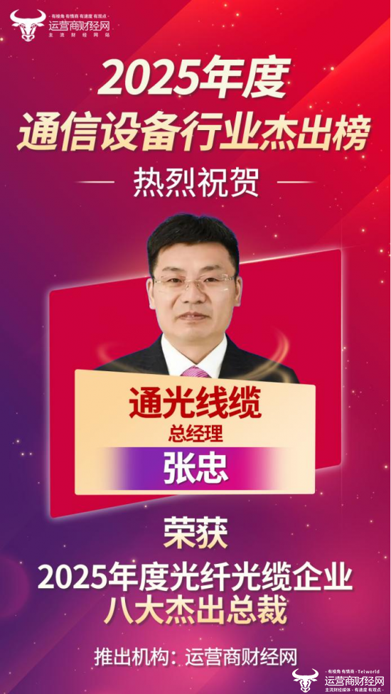 近日,运营商财经网综合考量企业业绩、高管行业知名度等信息,独家打造“2025年度光纤光缆企业八大杰出总裁”榜单。其中,通光线缆总经理张忠榜上有名。