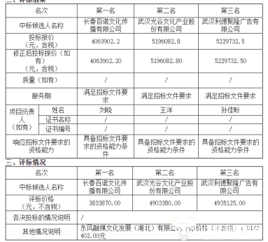 而东风融媒文化发展(湖北)有限公司评标价格8142402元,其报价显然是四家参选厂商中最高的,比报价第二高的厂商还要高出300多万元。最终遗憾落选。