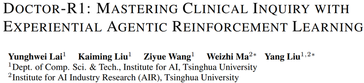 在这一背景下,清华大学刘洋团队提出了题为《DOCTOR-R1: Mastering Clinical Inquiry with Experiential Agentic Reinforcement Learning》的研究工作,试图从问题建模和训练范式层面打破以静态知识评测为中心的既有路径。