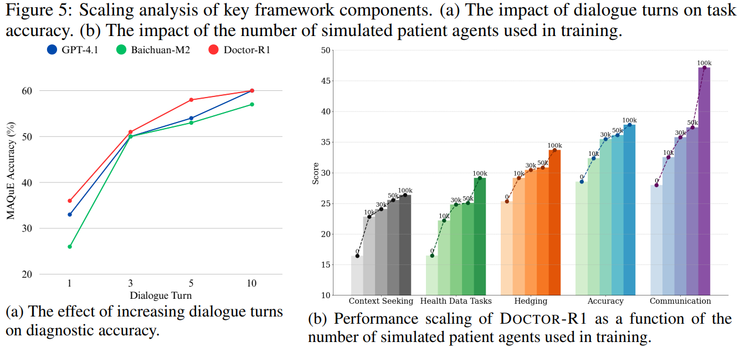 这一点在对话轮次与准确率关系的分析中也得以体现,DOCTOR-R1 从首轮对话开始即占据优势,并且随着对话推进持续扩大领先幅度,体现出一种越问越准的策略特征。