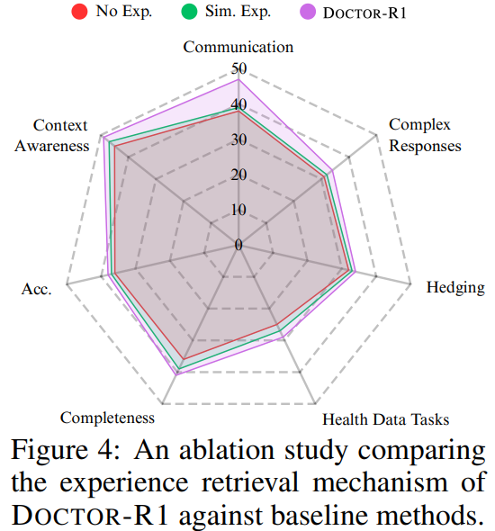 最后,在经验利用机制上,该研究并未将经验库视为普通的记忆模块,而是将其定位为经过筛选的“高质量医生经验”。研究人员通过仅存储高奖励轨迹、在检索时同时考虑语义相似度与历史奖励,并引入新颖性约束以避免模型反复依赖同一问诊套路,使模型在面对新患者时更接近一名积累了大量临床经验的医生,而非简单依赖答案记忆的学生。