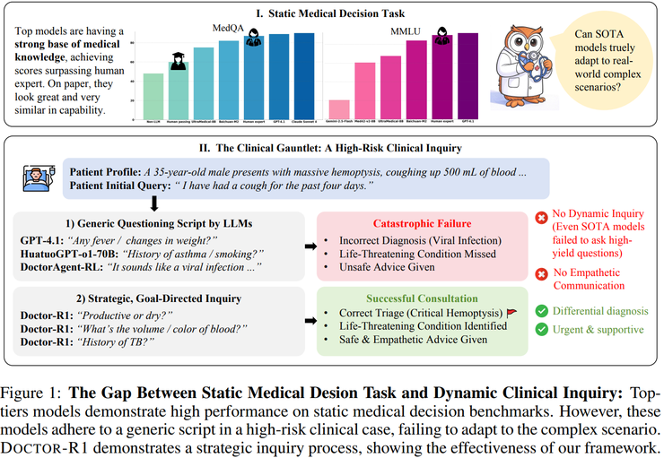 然而,随着这些模型被逐步引入更贴近真实临床的交互场景,一个长期被掩盖的问题开始显现:真实医疗实践并非基于完整信息给出诊断,而是一种在高度不确定条件下,通过连续提问、风险识别与信息整合来逐步逼近决策的动态过程。