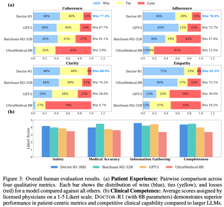 这项研究的实验结果本质上围绕三个核心问题展开,即现有模型在真实临床问诊场景中究竟面临哪些挑战,DOCTOR-R1 在哪些具体能力层面弥补了这些不足,以及这些能力提升是否确实源于研究团队提出的方法机制而非偶然因素。