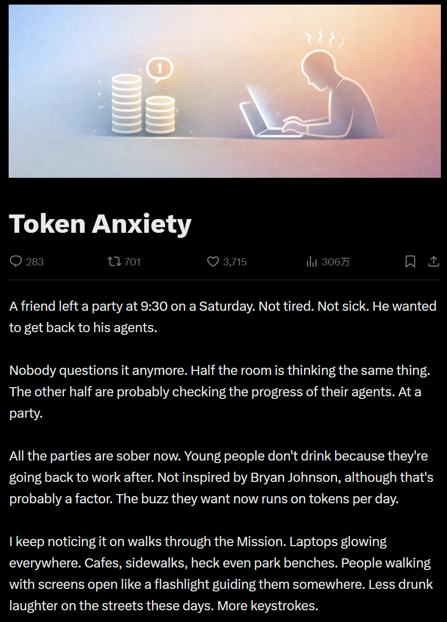 难怪最近 X 上的另一篇爆款文章《Token 焦虑》这么写道:周六晚上的九点半,有人提前离开了 party—— 并非因为疲惫,而是因为想尽快回到智能体那里。「现在没人会质疑这种行为了,房间里一半的人都在想同样的事情,而另一半人可能正在查看智能体的工作进展。这可是在派对上啊!」