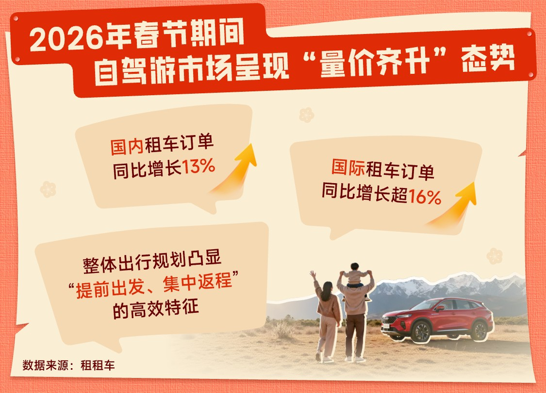 2月23日,全球自驾游平台发布《2026年春节全球自驾游报告》(以下简称《报告》),全景呈现了春节期间国内外自驾出游的市场表现与消费趋势。《报告》指出,受假期时间较晚、拼假便利等因素影响,2026年春节期间自驾游市场呈现“量价齐升”的活跃态势:国内租车订单同比增长13%,国际租车订单同比增长超16%。整体出行规划凸显“提前出发、集中返程”的高效特征,折射出游客对长假期的最大化利用理念。