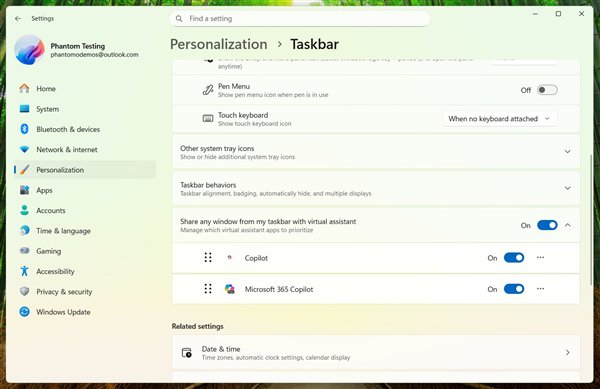 快科技2月24日消息,微软正在Windows 11任务栏设置中,测试一项向虚拟助手共享任务栏任意窗口的新功能。