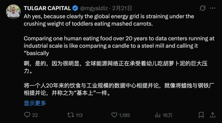 总体看,从 2 月 20 日视频发出来后,这两天迅速扩散,大概有 30%的回应是正面,中立 20%,负面占 50%。这反映了 AI 话题的两极化。一方面,它确实戳中了 AI 发展的痛点:能量是瓶颈,但技术的飞轮不能停。另一方面,技术也不能是真空的,最终得回到对人类生活的帮助和改善上。或许,如 Altman 所说,得建更多清洁能源是一种解法,但也如批评者言,无论未来出路是什么,得尊重人类独特价值。
