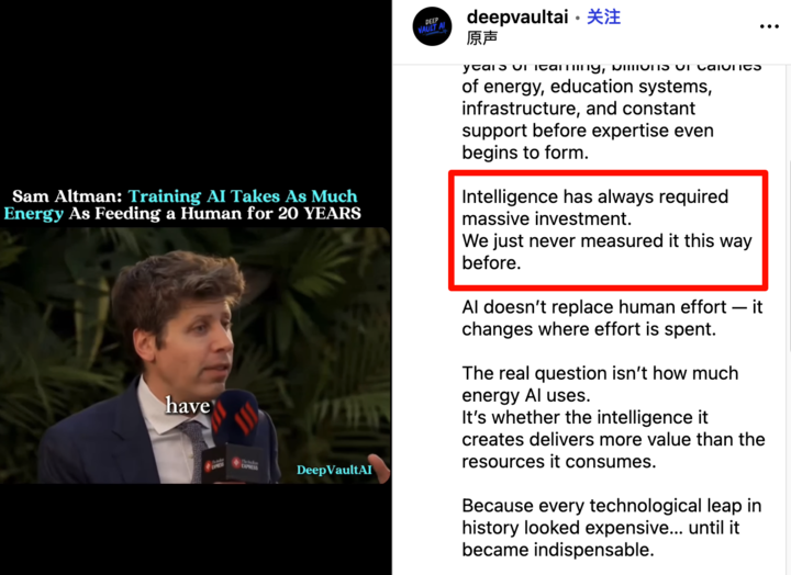 人一生的自然进化中,不仅有产出,还有情感、教育、成长的喜悦,这些能量计算不来,在舆论场上,这点被放大。一个油管博主打出标题「OpenAI CEO Argues Energy Is More Wasteful On Humans Than AI, Goes Very Poorly」,说 Altman 的言论进行得很糟糕。