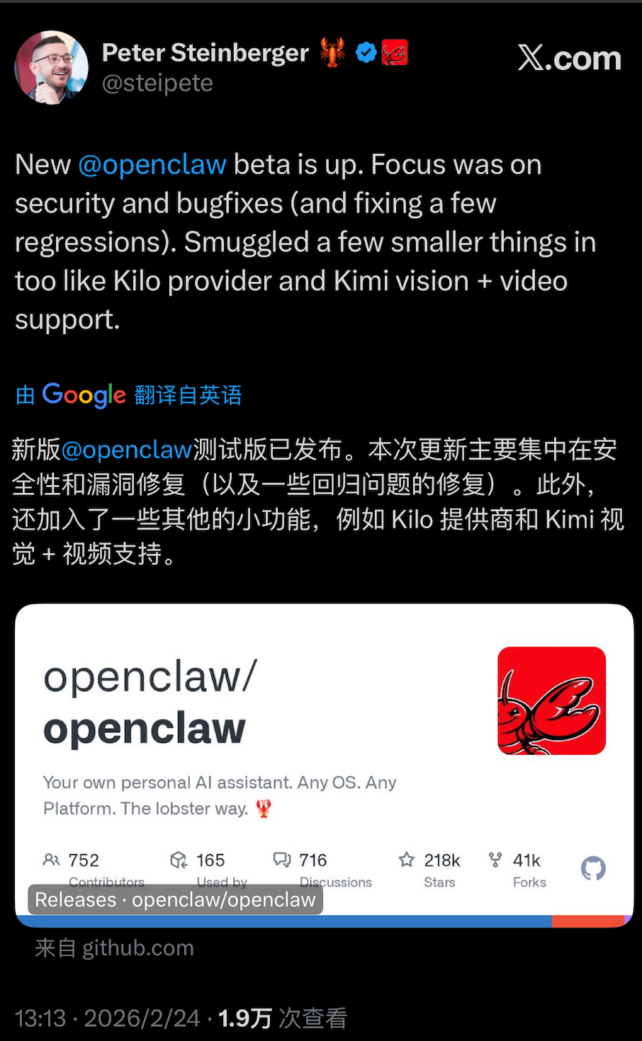 2月24日下午,Peter发布OpenClaw测试版本,更新重点聚焦于安全性与漏洞修复,并加入一些其他的小功能,包括Kilo提供商(OpenAI兼容的API网关)与Kimi视觉与视频支持。