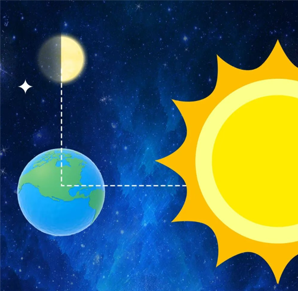 当太阳、地球与月球连线呈直角,且月球在太阳东边时,月球西边半球被照亮,呈现字母“D”形的半圆,称为上弦月。
