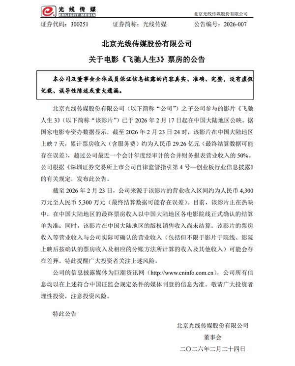 值得注意的是,29.26亿元的票房成绩,已经超过了光线传媒最近一个会计年度经审计合并营业收入的50%,触发了深交所的行业信息披露要求。这也从侧面反映出,《飞驰人生3》的票房表现对光线传媒2026年的业绩具有举足轻重的影响。