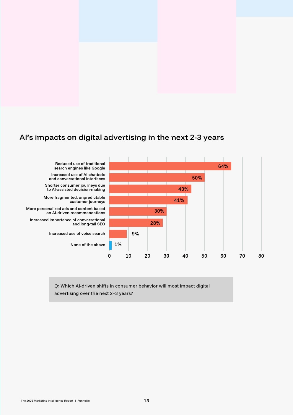 这些准备性行动是在内部营销人员和代理机构受访者认为,传统搜索引擎(如谷歌)使用率的减少将是未来2-3年内对数字广告影响最大的人工智能驱动的消费者行为转变之际采取的。近年来,搜索广告在美国数字广告支出中的份额已经下降,因此观察其在多大程度上受到人工智能驱动搜索的影响将颇具看点。