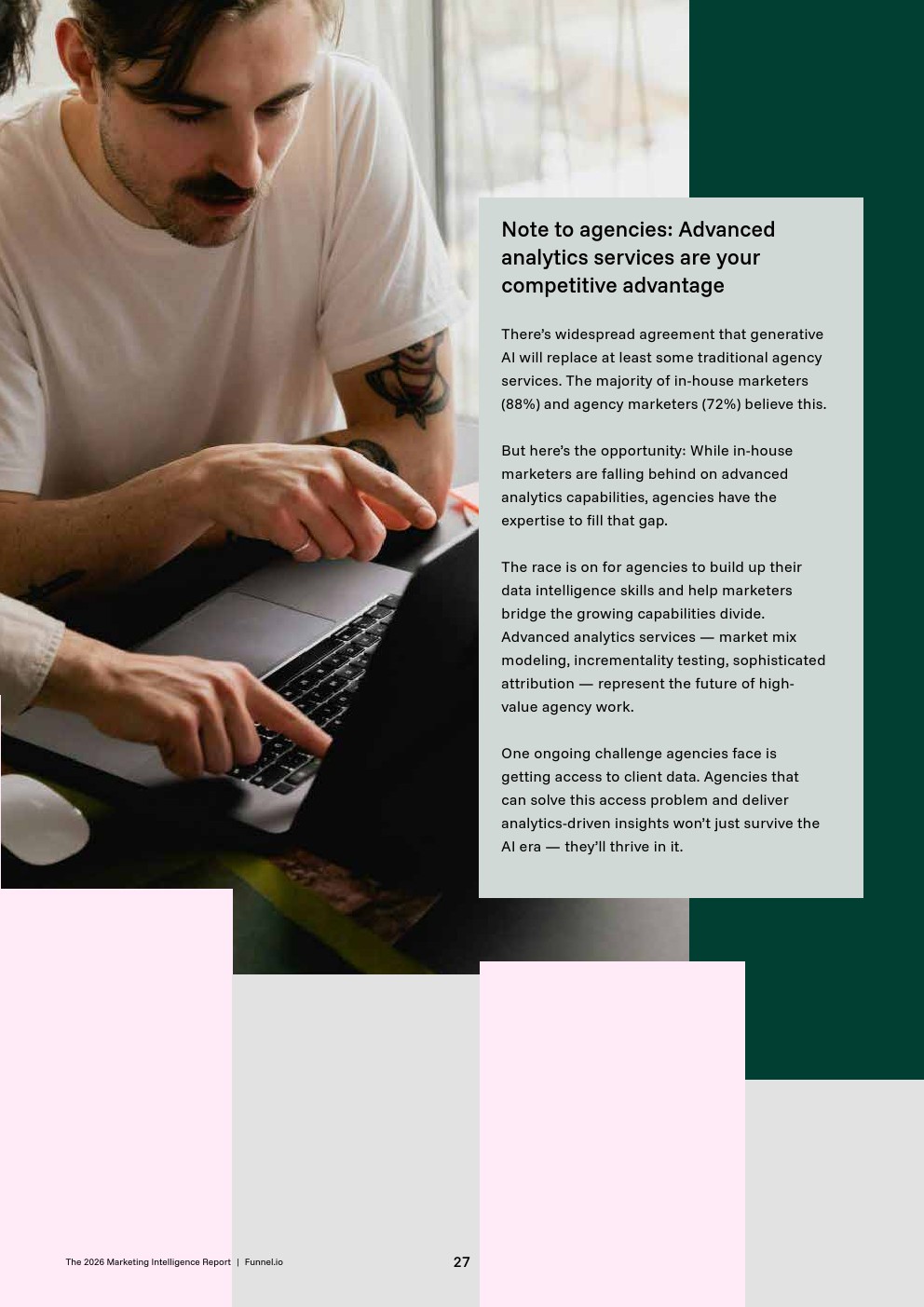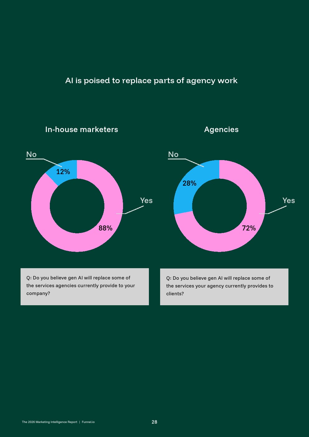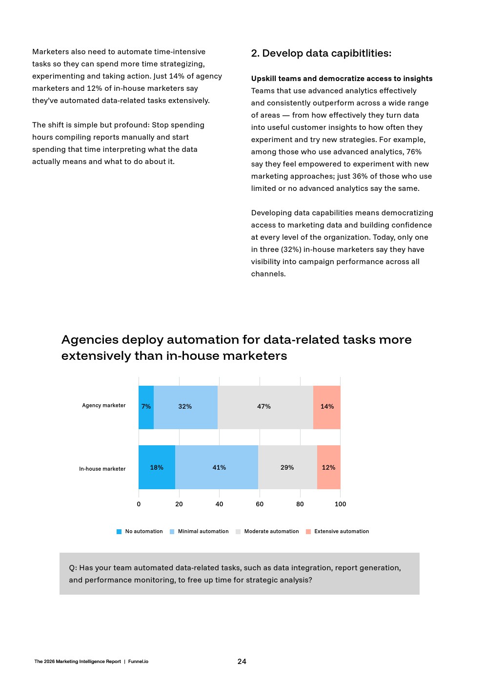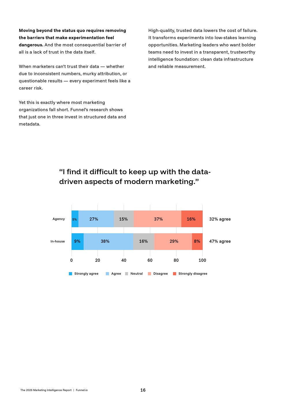 他们确实面临着艰巨的任务:47%的内部营销人员和32%的代理机构受访者同意,他们发现很难跟上现代营销的数据驱动方面。