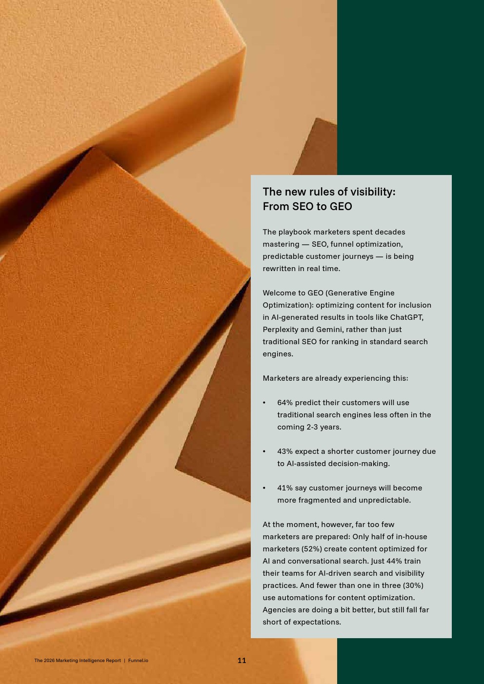 作为回应,绝大多数营销人员正在为搜索行业的这些人工智能变革做准备。内部营销人员最常采用的方式是创建专为人工智能和对话式搜索设计的内容,52%的受访者提到了这一点。紧随其后的是,44%的人正在培训团队掌握人工智能驱动的搜索和可见性实践。大约1/3的人正在测试人工智能驱动的广告活动格式(35%)并投资于结构化数据和元数据(33%),3/10的人正在自动化重复的搜索引擎优化和内容优化任务。